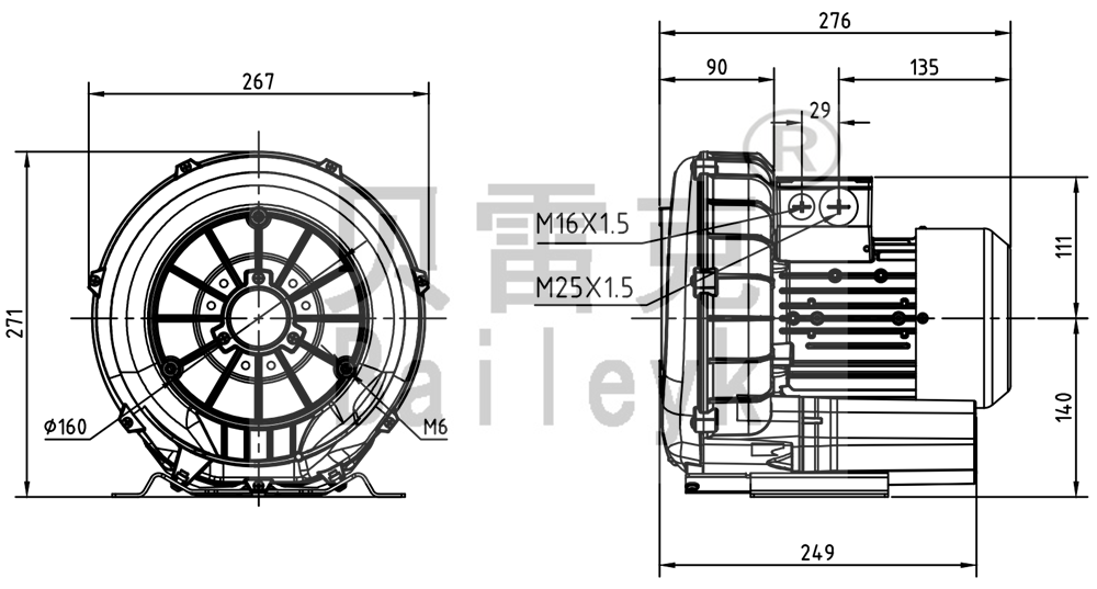 最大風量:140m3/h 最大正壓:100mbar 最大負壓:100mbar 防護等級:IP55 噪音:56db 重量:13Kg